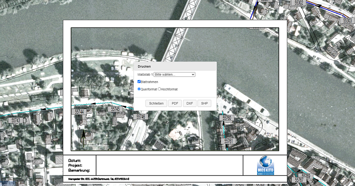 Auch der Menüeintrag Drucken öffnet einen Dialog. Dieser erlaubt es Ihnen einen Bildschirmausschnitt in einem gewählten Maßstab auszugeben. Sie haben bei der Ausgabe die Wahl zwischen den Formaten PDF, SHP und DXF.
