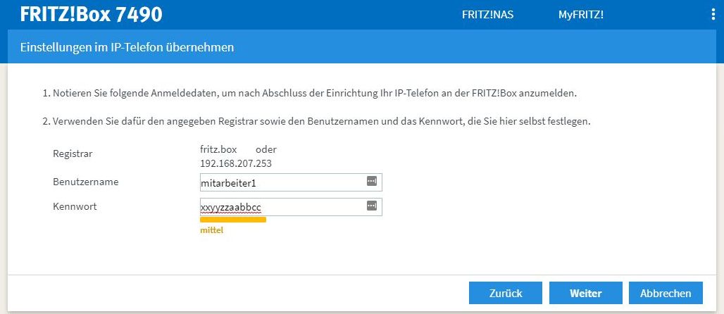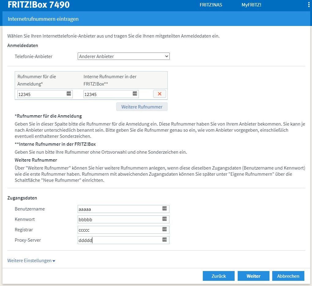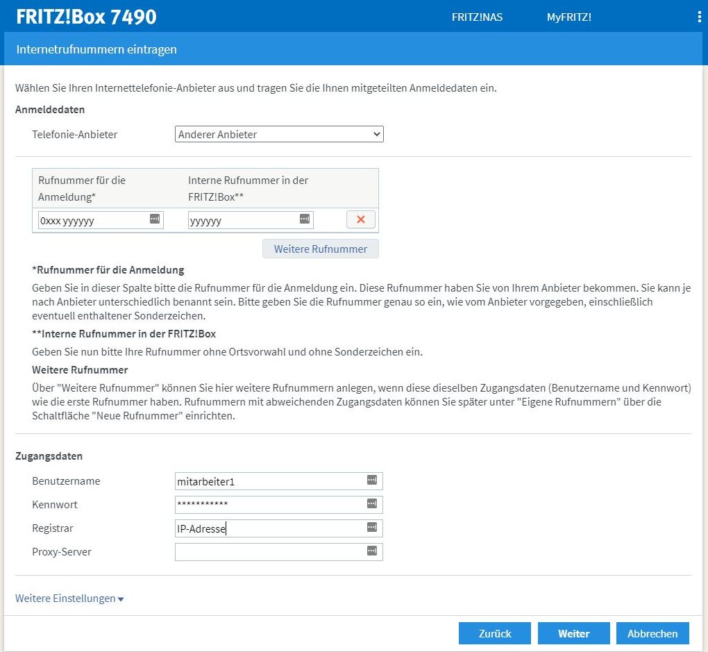 Die "Rufnummer für die Anmeldung" ist in unserem Fall ein Platzhalter, der sonst nirgendwo verwendet wird. Hier kann eine beliebige Nummer eingetragen werden. Die "Interne Rufnummer in der FRITZ!Box" verwenden wir in den kommenden Schritten für die interne Konfiguration der FRITZ!Box. Auch diese Nummer kann frei gewählt werden. Der Einfachheit halber verwenden wir in diesem Beispiel dieselbe Nummer.