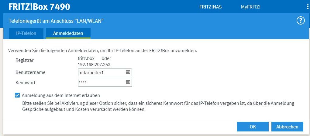 Bei den Zugangsdaten geben wir die Informationen ein, die wir von unserem VoIP Provider bekommen haben.