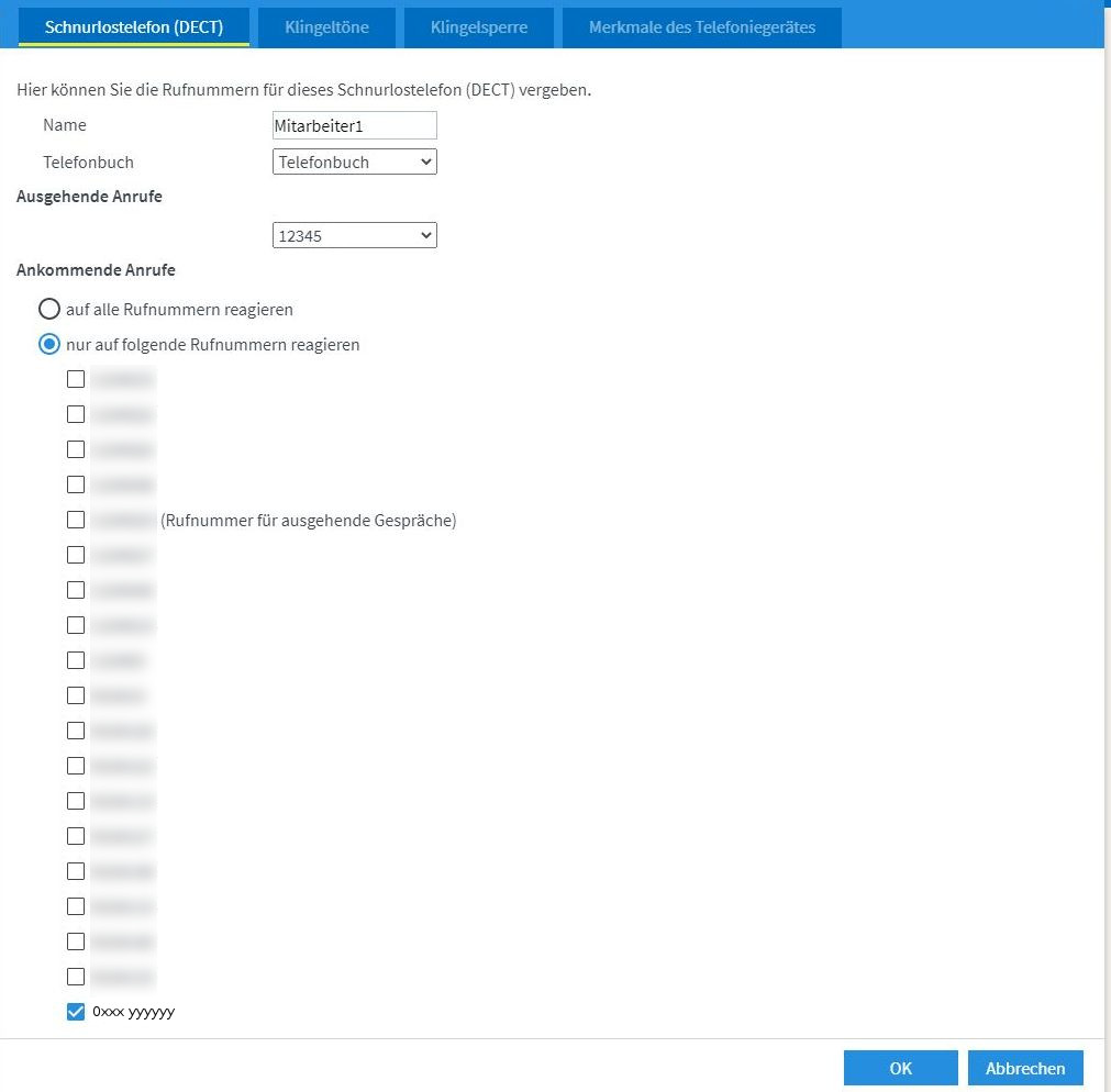 Im weiteren Verlauf des Einrichtungsassistenten wählen wir dann noch den, aus den vorherigen Schritten bekannten, Platzhalter für ausgehende Gespräche und die echte Rufnummer für eingehende Anrufe aus.