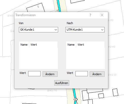 Anschließend kann mit dem Transformationsdialog die entsprechende Transformation (GK-Kunde1, GK-Kunde2, UTM-Kunde1 oder UTM-Kunde2) gewählt werden.